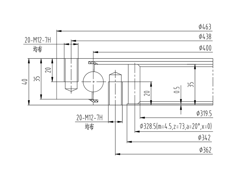 Before installation, confirm the flatness of the mounting surface and clean all impurities. Use the 2×Φ13H8 locating pins for precise positioning, and tighten the 20-M12-7H bolts evenly with a calibrated torque wrench to avoid uneven stress. Lubricate with high-quality lithium-based grease before initial operation, replenish grease every 100 working hours, and replace lubricant completely every 6 months. Conduct regular inspections of bolt tightness, gear meshing, and abnormal noise to ensure long-term stable performance of the excavator slewing bearing.