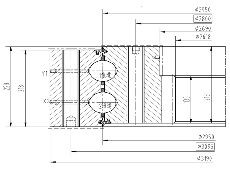 High-rigidity double-row ball structure: The double-row ball wind power pitch slewing ring adopts an integrated internal gear design, with a slewing center diameter of φ2950 mm, featuring a compact structure, ultra-high structural rigidity, and strong composite load-bearing capacity, which can withstand complex axial, radial, and overturning moment loads generated by wind turbine blades during operation.